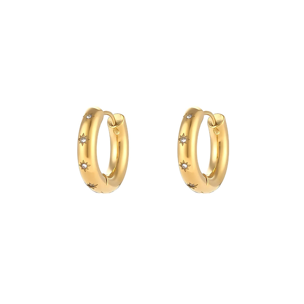 Descubra a sofisticação atemporal com o Brinco Argola Mini com Estrelas Cravejadas em Zircônia Banhado em Ouro 18k, uma peça autêntica da nossa exclusiva coleção clássica de semijoias.